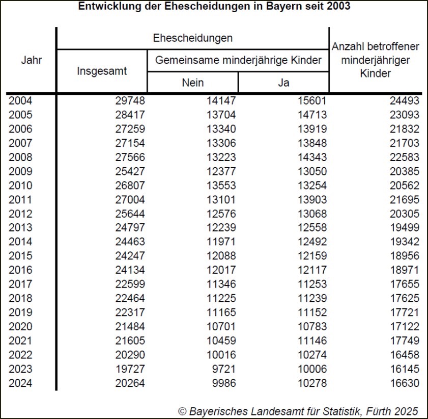 (ty) Laut aktueller Mitteilung des bayerischen Landesamts für Statistik sind im vergangenen Jahr im Freistaat insgesamt 20 264 Ehen geschieden worden, darunter 125 gleichgeschlechtliche Ehen von Frauen und 89 gleichgeschlechtliche Ehen von Männern. Im Vergleich zum Jahr 2003, als in Bayern mit insgesamt 29 992 Scheidungen der bisherige Höchststand registriert worden war, ist die Zahl der Scheidungen im Jahr 2024 um gut 32 Prozent zurückgegangen. Gegenüber dem Vorjahr 2023, für das 19 727 Ehescheidungen zu Buche stehen, ist die Zahl der geschiedenen Ehen dagegen um 2,7 Prozent gestiegen.