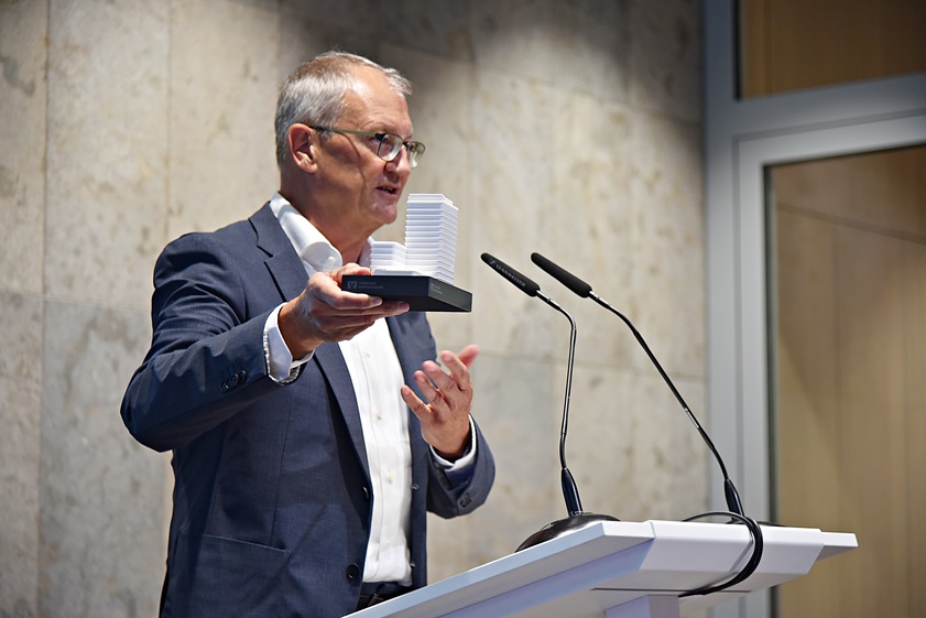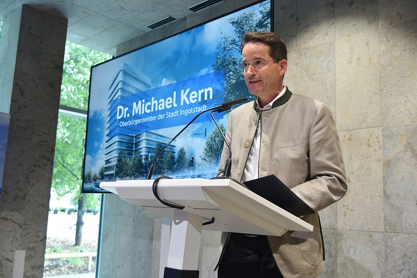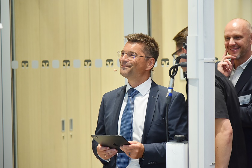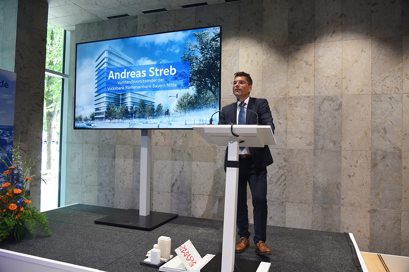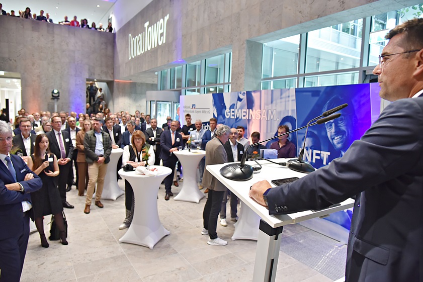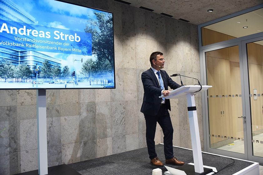 Franz Mirbeth, Vorstands-Mitglied der Volksbank-Raiffeisenbank Bayern-Mitte, zeichnete in seiner Ansprache die zweiphasige Entstehungs-Geschichte des Donau-Towers nach – von der dreijährigen Entwicklungszeit über die ebenfalls dreijährige Bauphase. Die Umsetzung dieses Großprojekts sei unter anspruchsvollen Rahmenbedingungen gelungen, betonte er. Die Herausforderungen – von der Corona-Pandemie über Lieferketten-Probleme bis hin zu sprunghaft steigenden Baukosten – hätten das Projekt-Team vor große Aufgaben gestellt.
