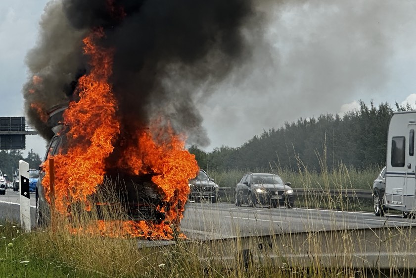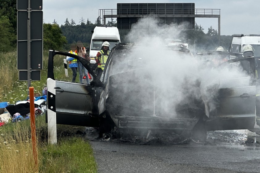 (ty) Zum Raub der Flammen geworden ist am gestrigen Nachmittag ein Pkw auf der A9 im Gemeinde-Gebiet von Denkendorf. Der Zwischenfall ereignete sich gegen 15.35 Uhr auf der Autobahn in Richtung Norden zwischen der Rast-Anlage "Köschinger Forst" und Denkendorf. Wie die zuständige Verkehrspolizei-Inspektion aus Ingolstadt heute berichtet, wurde zum Glück niemand verletzt: "Alle drei Insassen konnten das Fahrzeug unverletzt verlassen." Der Wagen sei vollständig ausgebrannt.