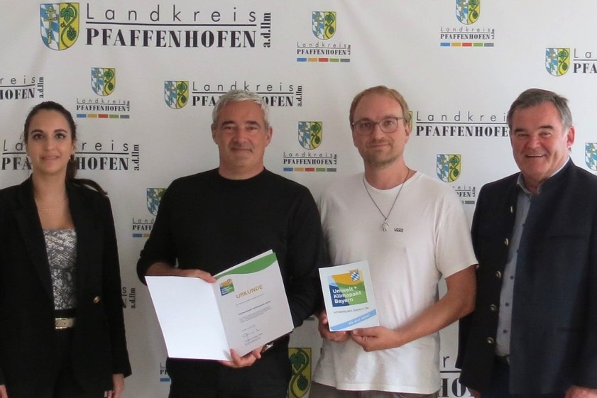 (ty) Die Werbe- und Design-Agentur "Ideehochzwei" aus Pfaffenhofen nimmt am bayerischen Umwelt- und Klimapakt teil. Landrat Albert Gürtner (FW) und Katharina Baschab, Abteilungs-Leiterin am Landratsamt, überreichten die Urkunde an den Geschäftsführer Stefan Herburger und Marco Bernd (Foto). Im Rahmen des Pakts habe sich die Firma zu qualifizierten, freiwilligen Umwelt-Leistungen verpflichtet und sei somit vom Staatsministerium für Umwelt, Gesundheit und Verbraucherschutz als Teilnehmer bestätigt worden, so die Kreisbehörde. Der Umwelt- und Klimapakt stehe allen bayerischen Betrieben offen, gleich welcher Größe. Die Teilnahme erfolge nach Antragstellung für zunächst drei Jahre, mit Option auf Verlängerung, und sei kostenfrei.