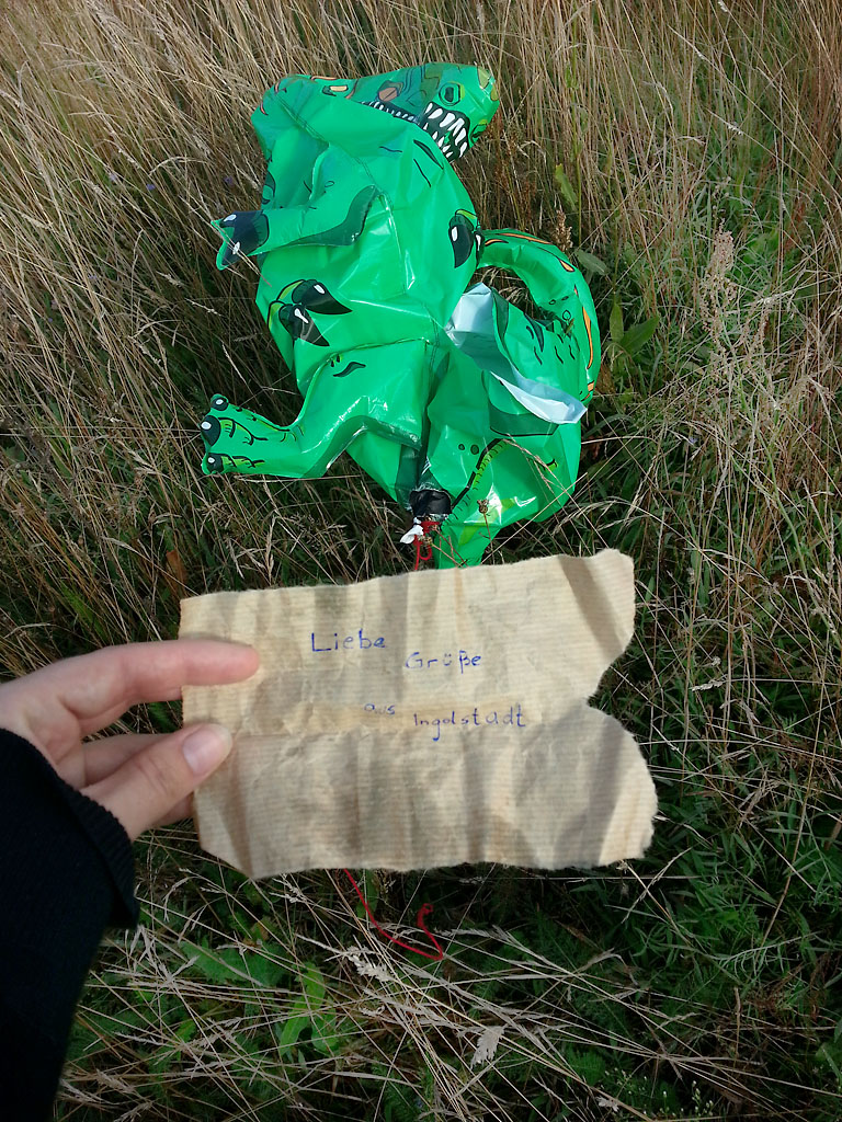 „Hallo, mein Name ist Franziska Sawadsky aus Liebenwalde. Mein Sohn Ben und ich haben heute morgen gegen 8.45 Uhr einen Ballon (Dino) gefunden der einmal mit Gas befüllt war. Natürlich ist dies nichts Ungewöhnliches – bis wir den kleinen Zettel, der daran befestigt war, geöffnet haben: ,Liebe Grüße aus Ingolstadt.’ Leider wurde keine Adresse oder ein Name hinterlassen, um zu Antworten, wo der liebe Gruß gelandet ist. Vielleicht könnt Ihr uns helfen, um einen kleinen Menschen glücklich zu machen, dass sein Ballon nun seine Reise beendet hat und in Liebenwalde/Brandenburg gelandet ist. Sollte sich jemand finden, so kann man mir bei gmx unter
