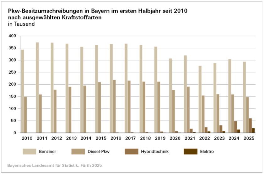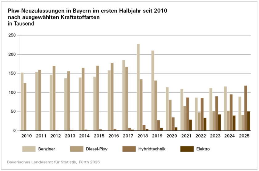 Wie das Landesamt für Statistik weiter mitteilt, sank die Anzahl der Pkw-Neuzulassungen in Bayern insgesamt im ersten Halbjahr leicht um 1,3 Prozent auf 300 169. Dabei fiel die Zahl der neu zugelassenen Pkw mit Benzin-Antrieb um 22,8 Prozent auf 89 440 und Diesel-Pkw um 20,9 Prozent auf 41 206. In der ersten Hälfte dieses Jahres wurden somit nur noch 43,5 Prozent der neu zugelassenen Pkw mit einem klassischen Verbrennungs-Motor mit Benzin oder Diesel angetrieben.