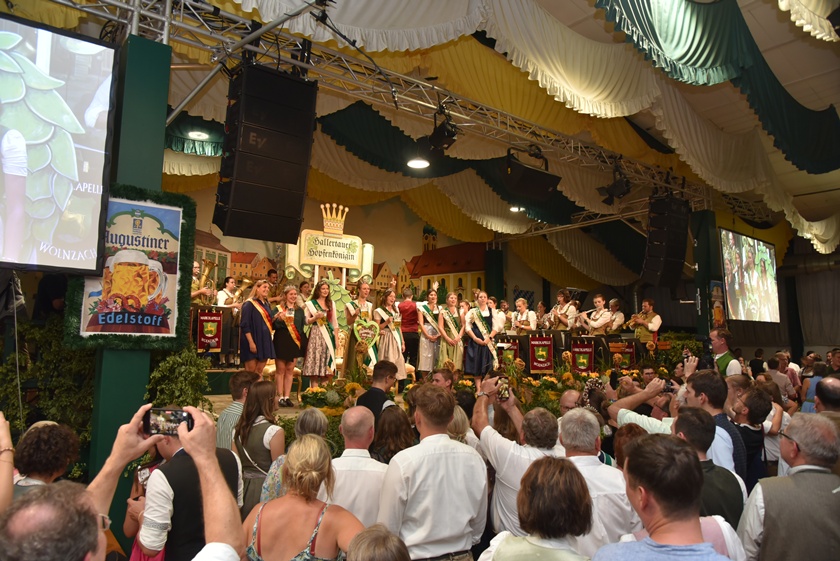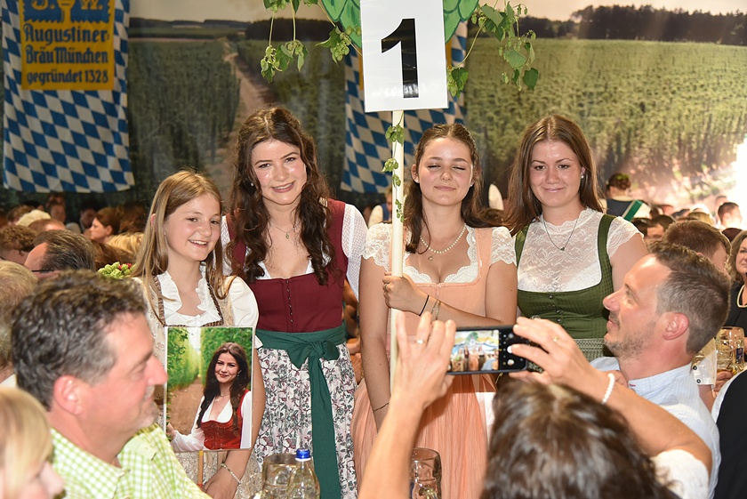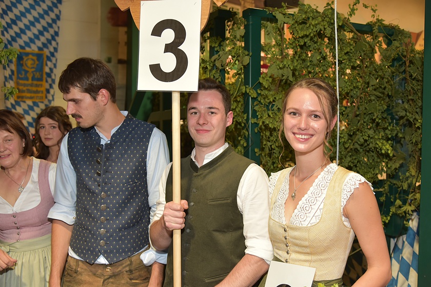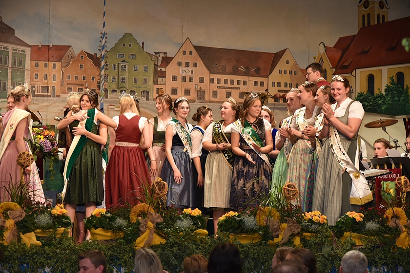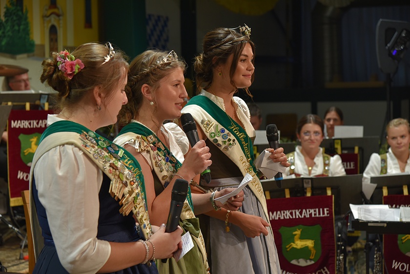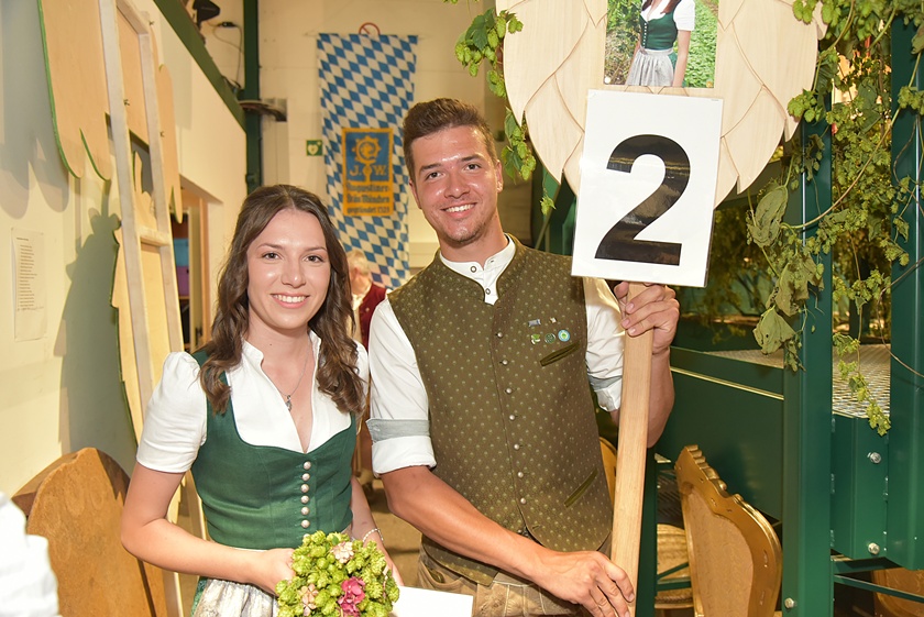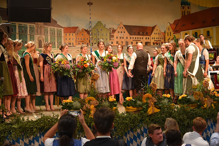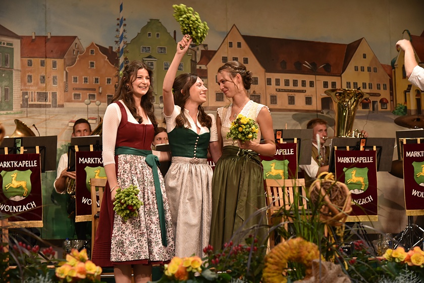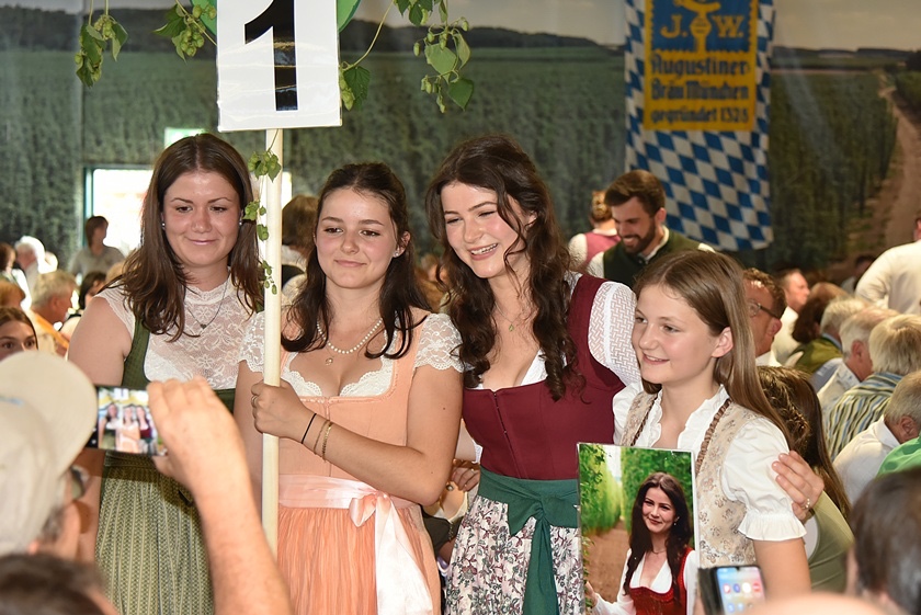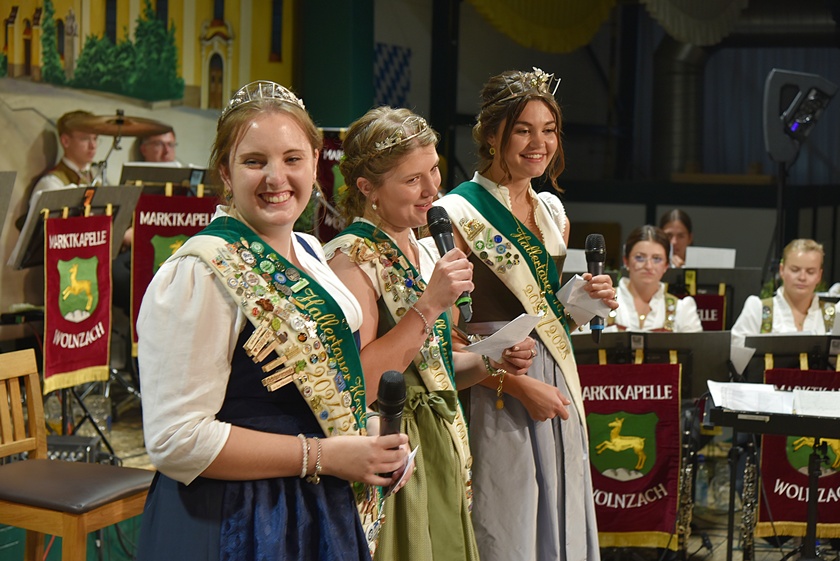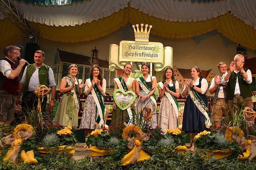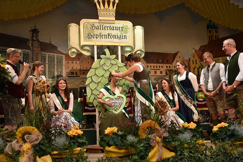 "Auch in diesem Jahr war die Anfrage nach Platzkarten zur Wahl der Hallertauer Hopfenkönigin auf dem Volksfest in Wolnzach wieder größer als im Vorjahr", berichtet der Hallertauer Hopfen-Pflanzer-Verband. "Schon lange kann nicht mehr jeder Wunsch erfüllt werden, weil schlichtweg immer mehr Besucher kommen wollen, als Plätze zur Verfügung stehen." Gestern drängten nach Angaben des Verbands etwa 2500 Leute in die Festhalle. Durch den Abend führte Alexander Nadler, der die Bewerberinnen befragte und ihnen die Gelegenheit zur Vorstellung gab. Das Publikum hatte schließlich die Qual der Wahl und musste in zwei Wahlgängen über die Platzierungen entscheiden.