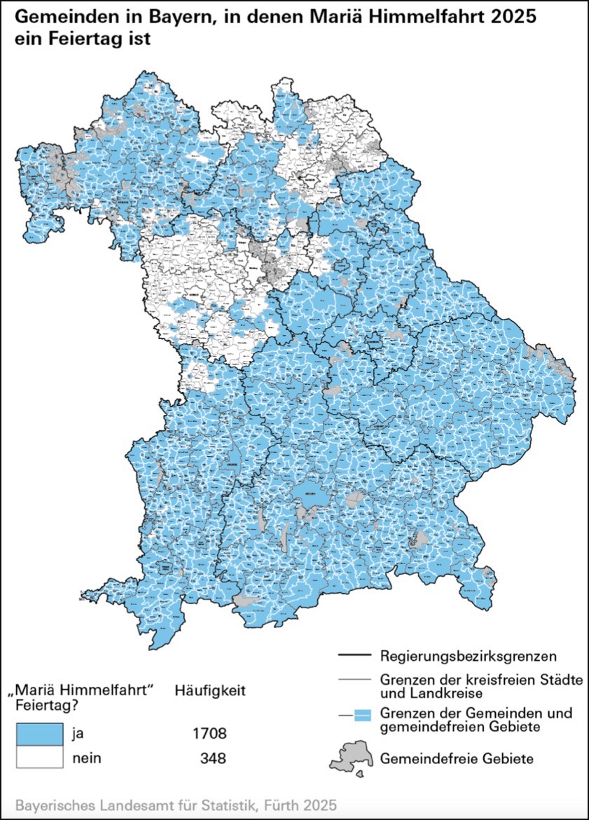 Während in Oberbayern und Niederbayern in allen Gemeinden der Anteil der katholischen Bevölkerung überwiege, zeichne sich im Norden des Freistaats ein heterogenes Bild ab, erklären die Statistiker: "Speziell im protestantisch geprägten Ober- und Mittelfranken überwiegt der Anteil der evangelischen Kirchen-Mitglieder." Dort sei "Mariä Himmelfahrt" in 54,2 beziehungsweise in 81,0 Prozent der Gemeinden kein gesetzlicher Feiertag. In Schwaben, Unterfranken und in der Oberpfalz ist der 15. August hingegen überwiegend ein Feiertag.