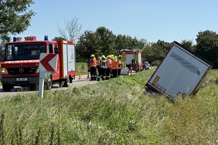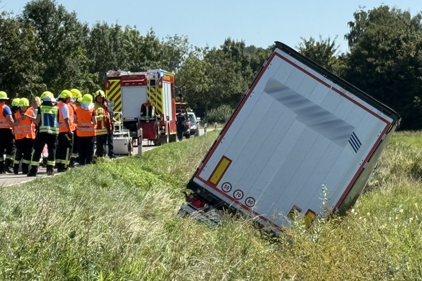 (ty) Ein Sattelzug-Unfall im Gemeinde-Bereich von Karlskron (Kreis Neuburg-Schrobenhausen) hat heute am späten Vormittag die Einsatzkräfte auf den Plan gerufen. Das Lastwagen-Gespann kam bei Probfeld zunächst von der Staatsstraße 2048 ab, landete daraufhin in starker Schräglage im Graben und drohte umzukippen. Wie ein Sprecher der Polizeiinspektion aus Schrobenhausen gegenüber unserer Zeitung erklärte, dauert die Sperrung der Staatsstraße vermutlich bis gegen 18 Uhr an.