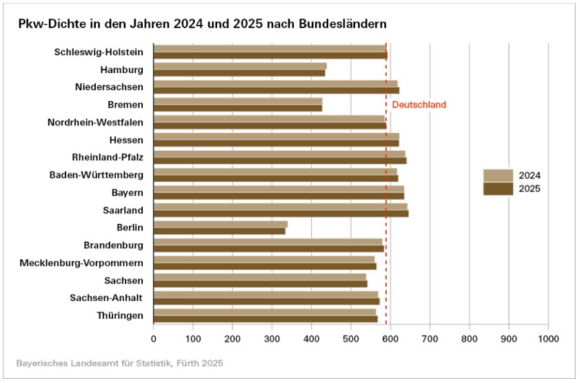 Deutschlandweit am niedrigsten sei die Pkw-Dichte in Berlin mit 334 Pkw je 1000 Einwohnerinnen und Einwohnern; das Saarland weise mit 646 die höchste Pkw-Dichte auf. Während die Pkw-Dichte bei etwas mehr als zwei Drittel der Bundesländer im Vergleich zum Vorjahr anstieg, sank diese in Hamburg, Bremen, Hessen und Berlin.