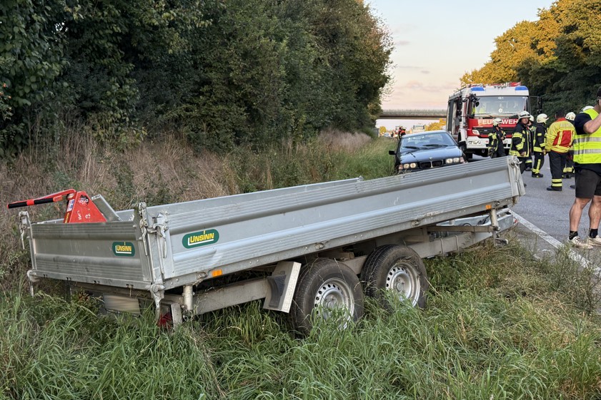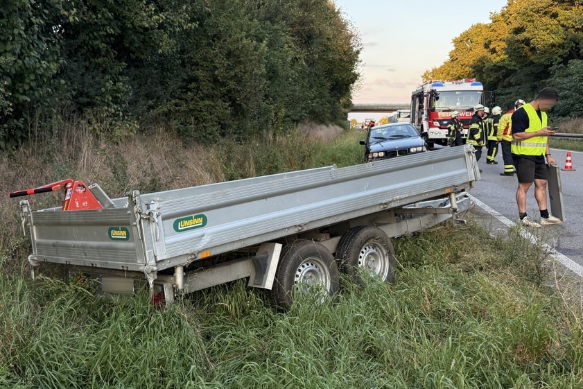 "Durch die Berührung und das Gegenlenken geriet der Anhänger ins Schlingern und überschlug sich schließlich", erklärt die Polizei. "Das Gespann kam nach rechts von der Fahrbahn ab und blieb im Grünstreifen stehen." Der 23 Jahre alte Pkw-Lenker habe leichte Verletzungen erlitten; er sei vom angerückten Rettungsdienst vor Ort versorgt worden. An seinem Auto und an dem Anhänger sei ein geschätzter Sachschaden in Höhe von insgesamt 3000 Euro entstanden. Der Pkw habe abgeschleppt werden müssen.