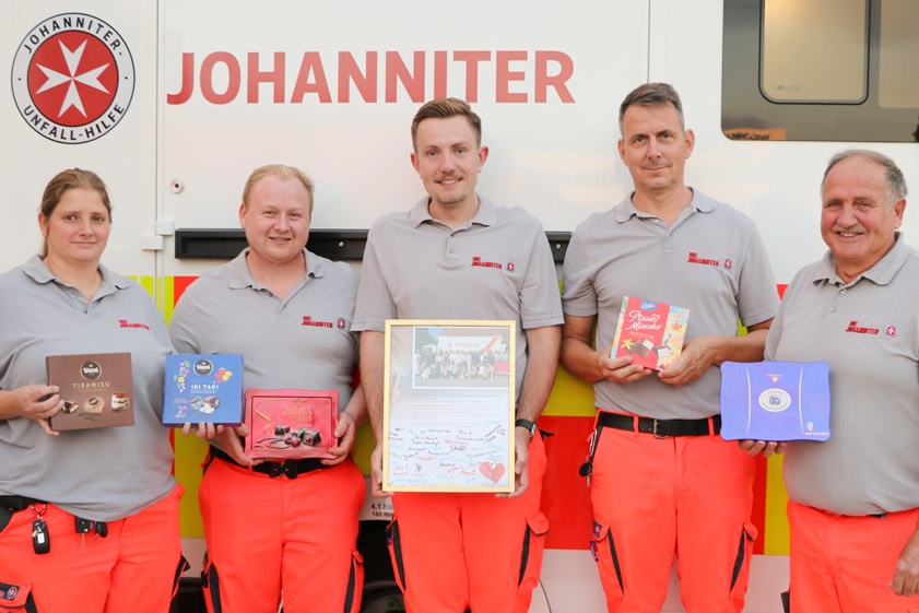 (ty) Eine besondere Geste der Dankbarkeit hat die Johanniter in Allershausen (Kreis Freising) erreicht: Die ehrenamtlich arbeitende Schnell-Einsatz-Gruppe (SEG) "Betreuung" habe "ein liebevoll zusammengestelltes Paket mit polnischen Spezialitäten als Zeichen der Wertschätzung für ihre geleistete Hilfe" erhalten. Das teilte die Organisation heute mit. Hintergrund dieses Geschenks sei ein Vorfall, der sich in den frühen Morgenstunden des 23. Juni ereignet habe. Gegen 2 Uhr sei ein polnischer Reisebus aufgrund eines technischen Defekts auf der Autobahn A9 bei Allershausen liegen geblieben – an Bord: rund 40 erschöpfte Reisende.
