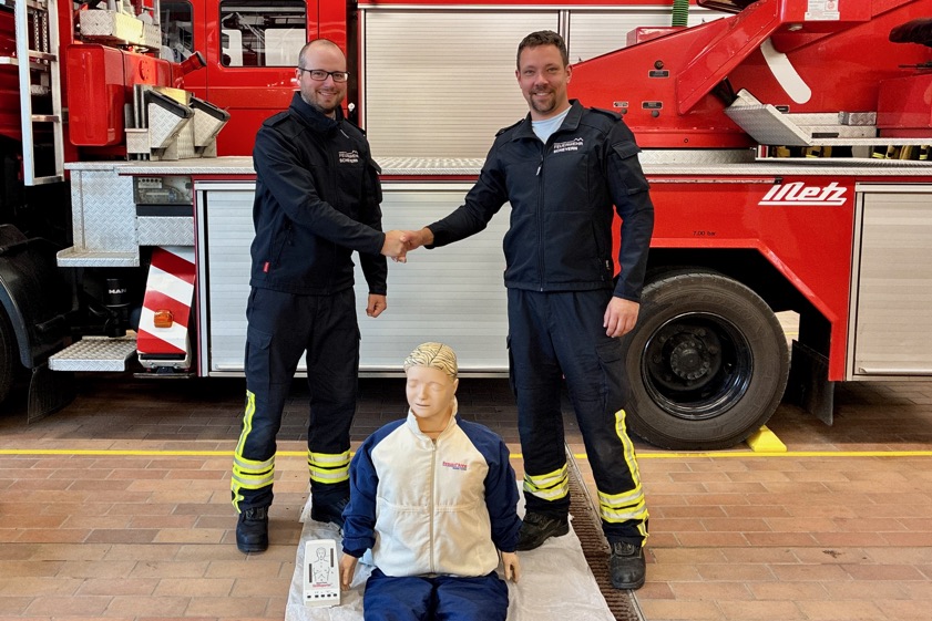 "Primär dient das Gerät zwar zur Absicherung der eigenen Einsatzkräfte, wird allerdings im Bedarfsfall auch von der Integrierten Leitstelle Ingolstadt zu medizinischen Notfällen der Scheyrer Bürger alarmiert und eingesetzt", erklärt die Feuerwehr. Für Übungen zum Thema "Erste-Hilfe" stehe der Feuerwehr von Scheyern nun dank einer Spende von Berni und Christoph Prause eine eigene Übungs-Puppe mit zahlreichen Funktionen zur Verfügung. Das Foto oben zeigt die Übergabe dieser Übungs-Puppe von Christoph Prause an Martin Ruland.