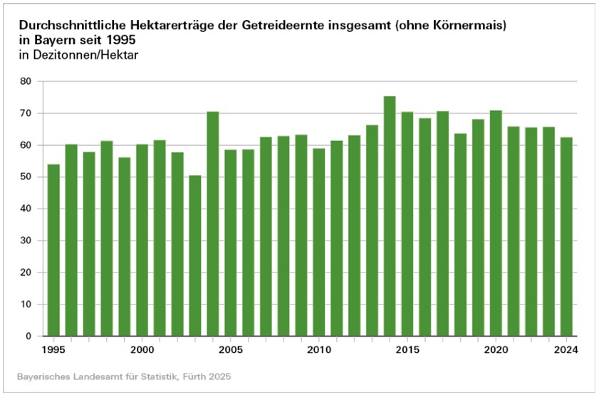 Die geringsten Hektar-Erträge bei der Getreide-Ernte in Bayern habe es in den vergangenen drei Jahrzehnten mit 50,6 Dezitonnen je Hektar beziehungsweise 54,0 Dezitonnen je Hektar in den Jahren 2003 und 1995 gegeben, teilte die Behörde weiter mit. Die Anbau-Fläche für Getreide im Freistaat habe sich im Zeitraum von 1995 bis 2024 um etwa ein Fünftel (21,3 Prozent) von 1 111 296 Hektar auf 874 846 Hektar verringert.