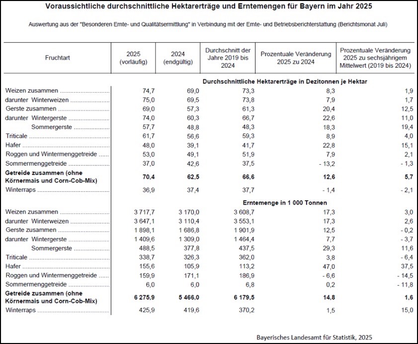 Der durchschnittliche Hektar-Ertrag bei der Sommergerste in Bayern liege mit voraussichtlich 57,7 Dezitonnen je Hektar um 18,3 Prozent deutlich über dem Vorjahres-Niveau von 48,8 Dezitonnen je Hektar. Mit 84 635 Hektar Anbaufläche, das sind 9,3 Prozent mehr als im Vorjahr, werde voraussichtlich eine Ernte-Menge von rund 0,5 Millionen Tonnen eingefahren. Damit läge die Ernte-Menge bei der Sommergerste heuer um 29,3 Prozent über dem Vorjahr und um 11,6 Prozent über dem Durchschnitt der Jahre 2019 bis 2024.