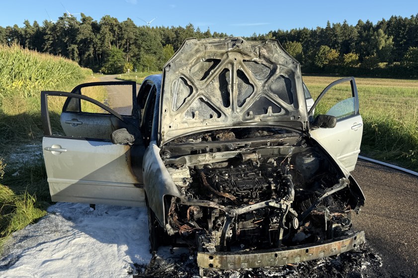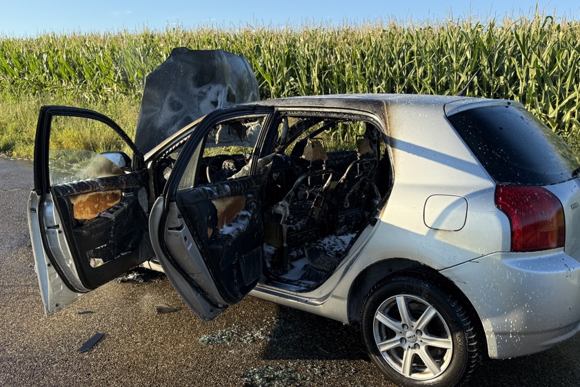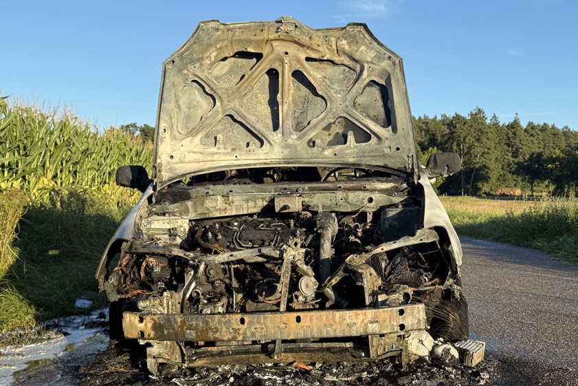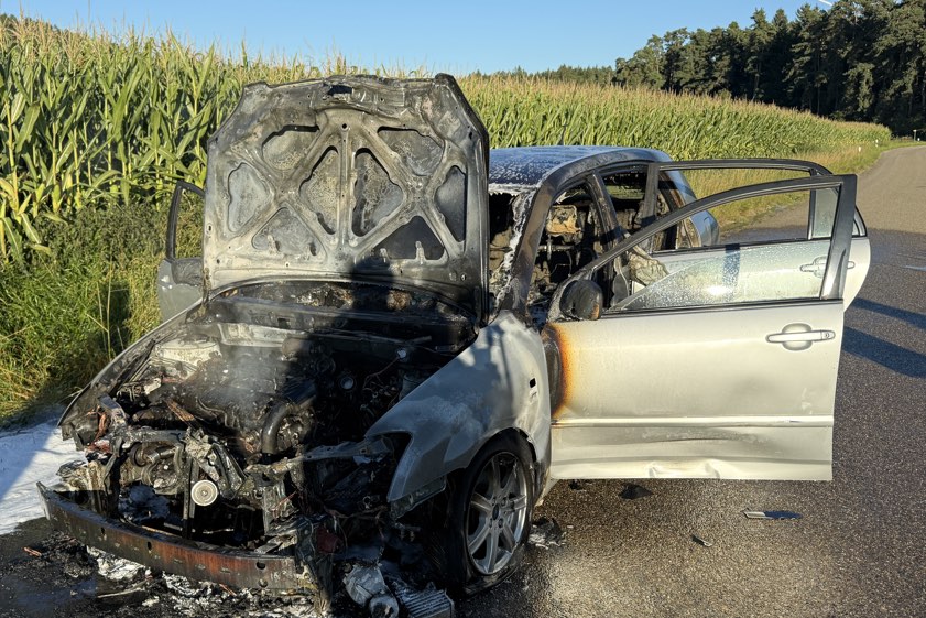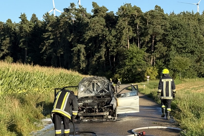 (ty) Ein Pkw ist am frühen gestrigen Abend im Bereich von Aresing (Kreis Neuburg-Schrobenhausen) während der Fahrt in Flammen geraten und letztlich komplett ausgebrannt. Wie die Polizei heute berichtet, steuerte eine 79 Jahre alte Frau aus dem Gemeinde-Gebiet von Pfaffenhofen an der Ilm den Wagen, als es zu dem Zwischenfall kam. Mit an Bord habe sich ihr Ehemann befunden. Während die beiden auf der Gerolsbacher Straße unterwegs waren, stellten sie den Angaben zufolge gegen 18.15 Uhr fest, dass Rauch aus dem Motorraum des Autos drang.