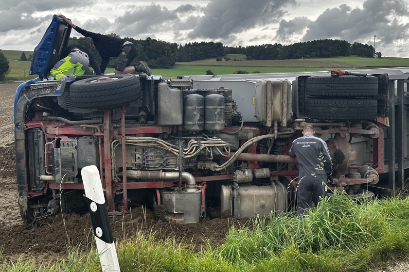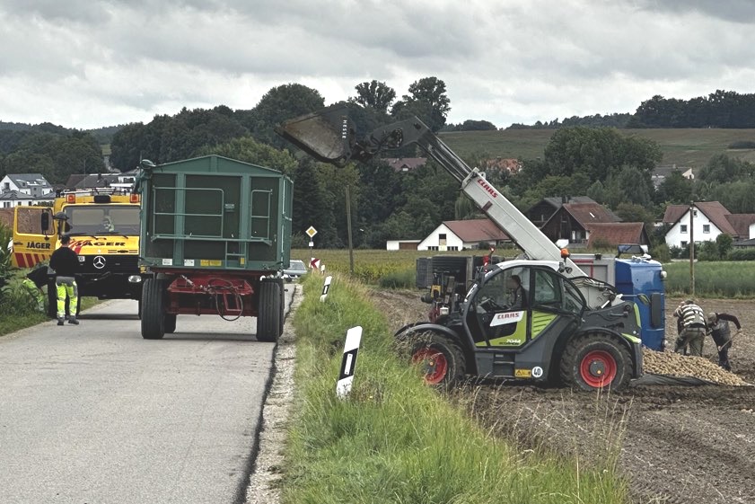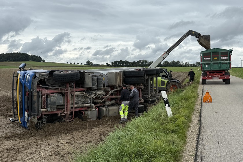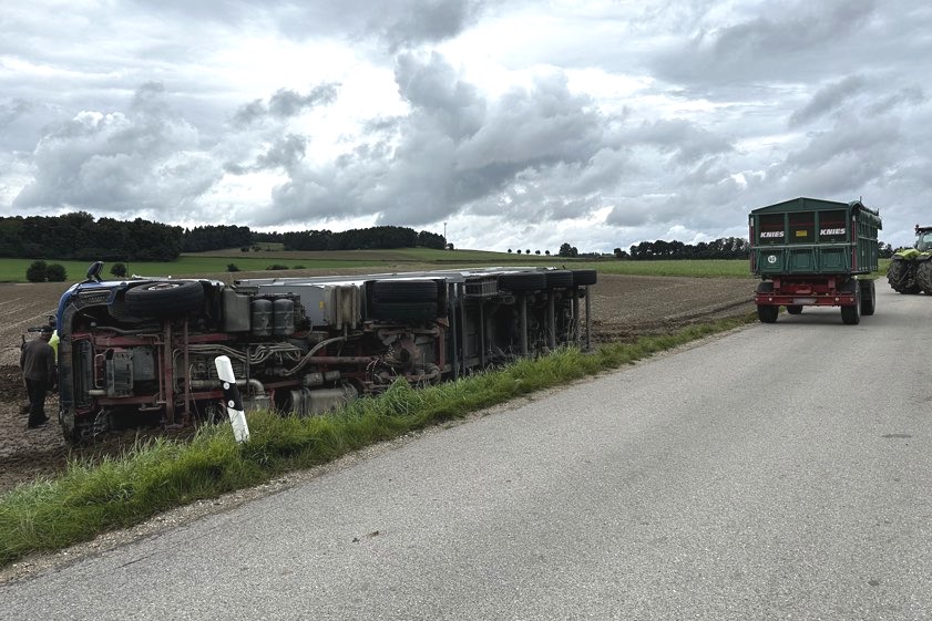 (ty) Ein Lastwagen-Unglück hat sich am heutigen Vormittag im Gemeinde-Gebiet von Aresing (Kreis Neuburg-Schrobenhausen) ereignet. Nach Angaben der Polizei geschah der Verkehrsunfall gegen 9.45 Uhr auf der Verbindungsstraße zwischen Aresing und dem Ortsteil Oberlauterbach, als sich ein Traktor samt Anhänger und ein Lastwagen samt Anhänger entgegenkamen. Beim Passieren sei der Lkw-Fahrer zu weit nach rechts ausgewichen. Sein mit 20 Tonnen Kartoffeln beladenes Gespann sei auf die nasse Erde geraten und nach rechts in den Graben gekippt.