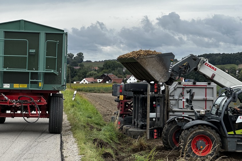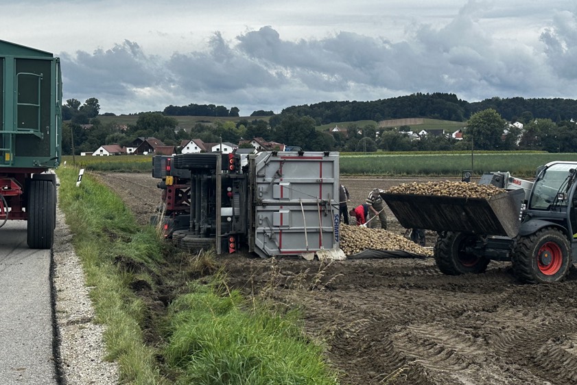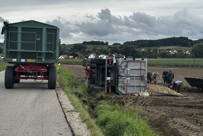 "Dabei flogen die geladenen Kartoffeln auf die Fahrbahn und in den Grünstreifen", berichtet ein Polizei-Sprecher. Der 27 Jahre alte Lastwagen-Lenker habe sein Führerhaus unverletzt verlassen können. Der an dem Lkw-Gespann entstandene Sachschaden wurde von Streifenbeamten auf 20 000 Euro geschätzt. Die Straße sei vom Gemeinde-Bauhof gesperrt worden. Der Lkw sei von einem Abschlepp-Dienst geborgen worden. "Die Kartoffeln konnten wieder geladen beziehungsweise umgeladen werden", so der Polizei-Sprecher.