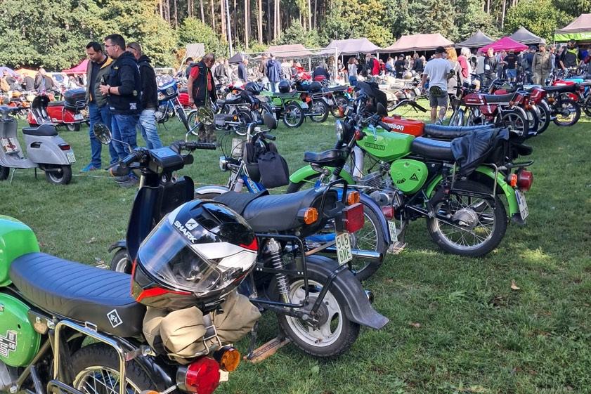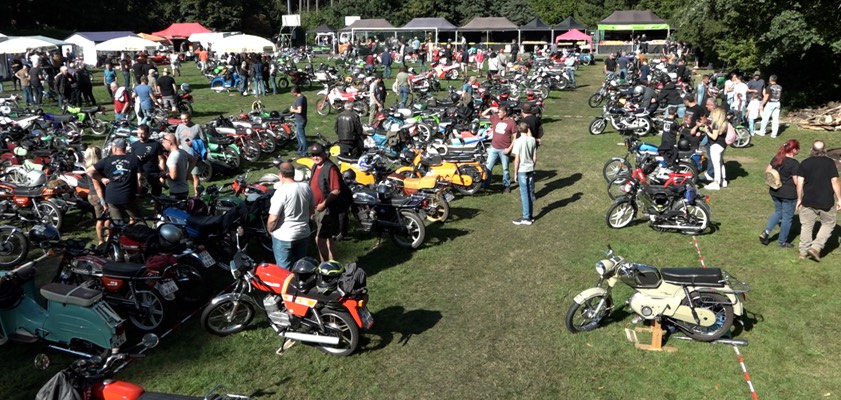 (ty) Ein besonderer Ausflug hat die "Zwoa-Takt-Schnecken" aus Hettenshausen am gestrigen Samstag gemeinsam mit den "Bembegga Henasprenga" aus Pörnbach zu den befreundeten "Schluchtenflitzern" nach Schrobenhausen geführt (Fotos). Im Nachbar-Landkreis stieg nämlich die 17. Auflage des weithin bekannten Schluchtenflitzer-Treffens. Um die 800 Mofas und Mopeds verschiedener Marken gab es dort zu sehen – viele Oldtimer und rollende Raritäten. Für die beiden Gruppen aus dem Kreis Pfaffenhofen begann der Tag traditionsgemäß: Die Hettenshausener steuerten erst einmal nach Pörnbach, gemeinsam stärkte man sich bei einem Weißwurst-Frühstück und besprach die anstehende Route.