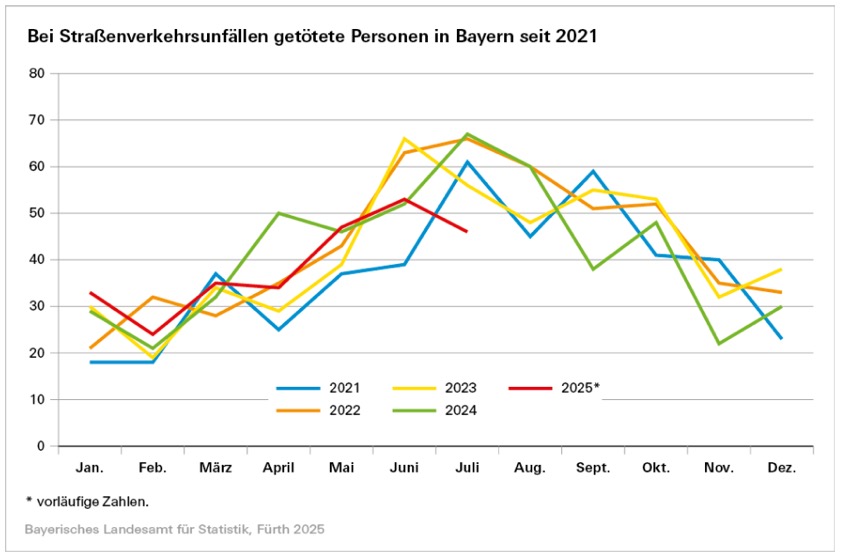 Von Januar bis einschließlich Juli dieses Jahres sank die Zahl der in Bayern registrierten Straßenverkehrsunfälle gegenüber dem Vorjahres-Zeitraum um 1,2 Prozent auf 220 798. Die Zahl der insgesamt verunglückten Personen fiel dabei um 4,7 Prozent auf 35 603 – die Zahl der ums Leben gekommenen Verkehrsteilnehmer reduzierte sich um 25.