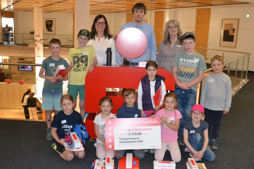 (ty) Einen Blick hinter die Kulissen der Sparkassen-Zentrale in Pfaffenhofen haben insgesamt 20 Buben und Mädchen im Rahmen einer vom Kreisjugendring (KJR) angebotenen Ferien-Veranstaltung geworfen. Ingrid Stock, Vorstands-Mitglied des Geldinstituts, überreichte bei dieser Gelegenheit einen Scheck über 2750 Euro an den KJR. In Empfang genommen wurde die Spende vom KJR-Vorsitzenden Bernhard Schäffer (Foto oben). "Die Sparkasse leistet mit ihrer großzügigen Spende einen wesentlichen Beitrag dazu, dass das Ferien-Programm für die Kinder kostenlos ist", betonte er. Die Sparkasse unterstützt das Ferienpass-Programm des Kreisjugendrings seit vielen Jahren.