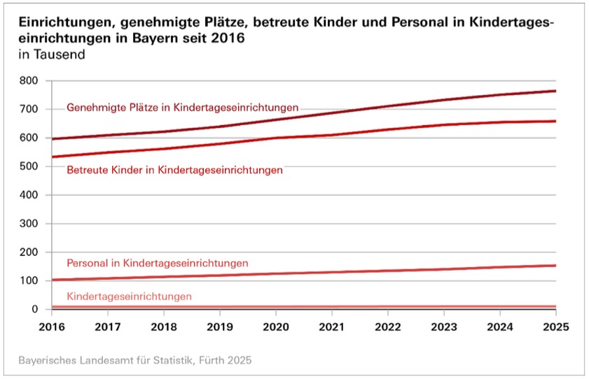 (ty) Zum Stichtag am 1. März dieses Jahres hat es in Bayern insgesamt 10 511 Kinder-Tages-Einrichtungen gegeben. Das sind 113 mehr als im März vergangenen Jahres. In Summe standen heuer im März nach Angaben des bayerischen Landesamts für Statistik in den genannten Einrichtungen 764 300 Betreuungsplätze zur Verfügung – ein Plus von 1,8 Prozent im Vergleich zum Vorjahres-Monat. Die Zahl der in Kitas betreuten Buben und Mädchen stieg um 0,6 Prozent auf 658 326.