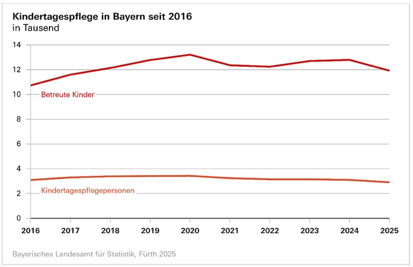 In der öffentlich geförderten Kinder-Tages-Pflege zählte das Landesamt für Statistik zum 1. März heuer insgesamt 11 922 Sprösslinge, die von 2911 Personen betreut werden. Die Zahl der Kinder sank gegenüber dem Vorjahr um 6,8 Prozent, die der Betreuerinnen und Betreuer nahm um 6,1 Prozent ab. Insgesamt waren zum Stichtag in Bayern 669 940 Buben und Mädchen in Kinder-Tages-Betreuung. Gegenüber dem Vorjahres-Zeitpunkt entspricht das einem Anstieg um 0,4 Prozent. Kinder, die sowohl in einer Kinder-Tages-Einrichtung als auch in der öffentlich geförderten Kinder-Tages-Pflege betreut wurden, wurden hierbei nur einmal gezählt.
