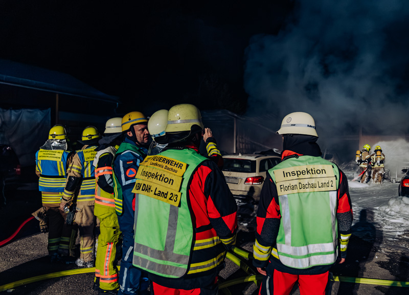 Bereits zehn Minuten nach der Alarmierung seien die ersten Einsatzkräfte der Feuerwehren aus Haimhausen und Unterschleißheim vor Ort eingetroffen, erklärt die Dachauer Kreisbrandinspektion. Zu diesem Zeitpunkt standen den Angaben der Floriansjünger zufolge bereits das Gebäude sowie etliche Fahrzeuge auf einer Gesamtfläche von rund 600 Quadratmetern in Flammen. "Durch den großen Feuerschein und laute Knall-Geräusche, die von explodierenden Gasflaschen herrührten, wurden zahlreiche Anwohner aufgeschreckt."
