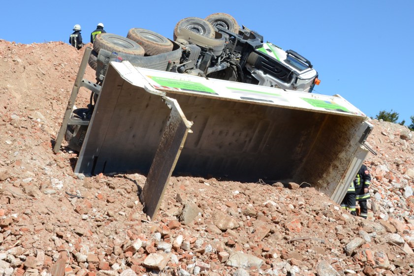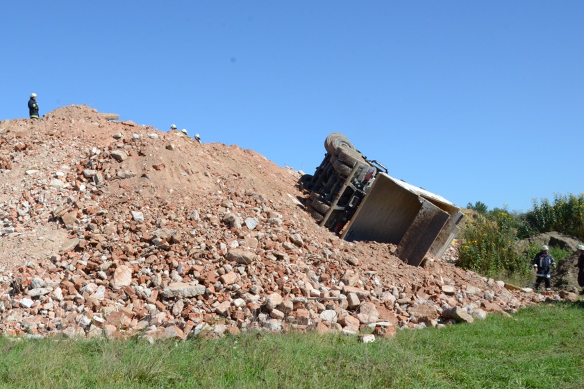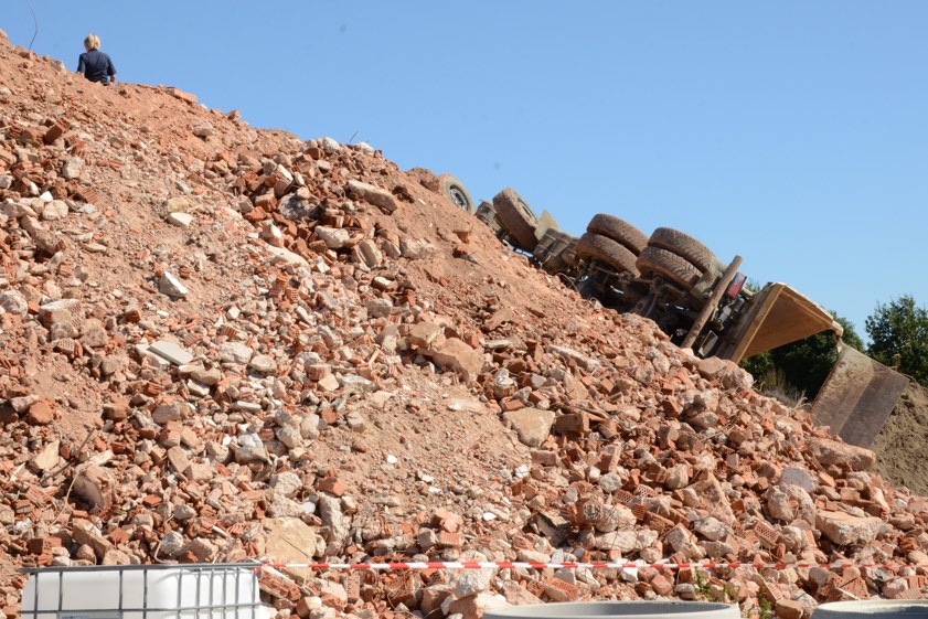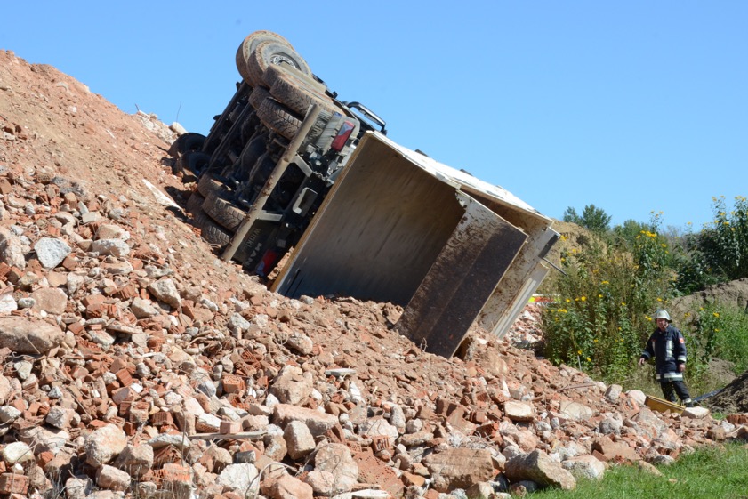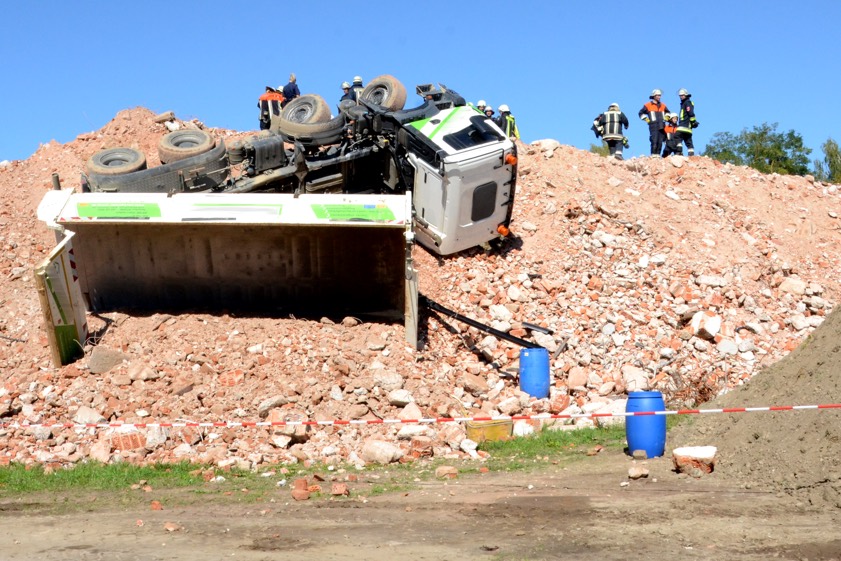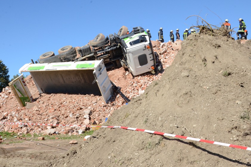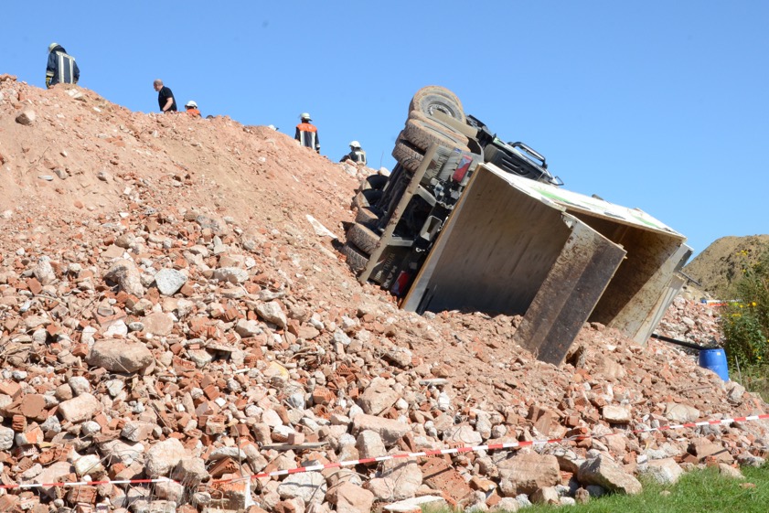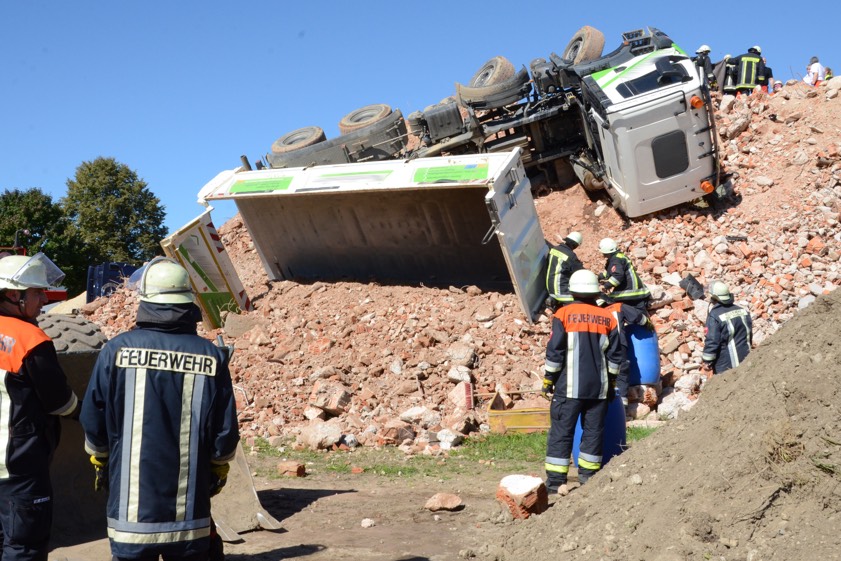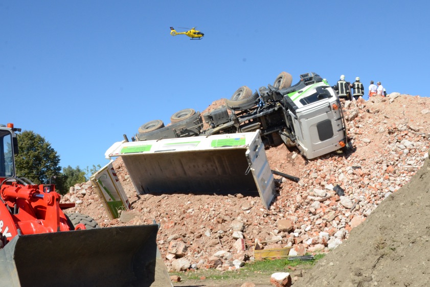 Kipper-Unfall heute Mittag bei Ablade-Vorgang auf Schutt-Berg an der Schulstraße. Fahrer per Rettungs-Helikopter in Klinik gebracht.