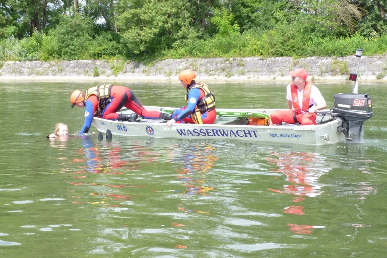 Von den Teilnehmern mussten verschiedenste Übungsszenarien abgearbeitet werden. „So musste am Baggersee eine Puppe mit Tauchermaske, Schnorchel und Flossen unter Anwendung von Suchmustern gerettet, an Land gebracht und medizinisch versorgt werden“, berichtet Alexander Wecker, der Technische Leiter der Kreiswasserwacht Ingolstadt. Auf der Donau wurde an drei verschiedenen Bootstypen das Retten mit dem Motorboot geübt. Standardisiert setzt die Wasserwacht hier ein Spineboard zum Retten und auch zur Übergabe an den Landrettungsdienst ein. An der Schillerbrücke übten die angehenden Wasserretter den Einsatz des Wurfsacks und den Einsatz als Schwimmer zur Personenrettung.