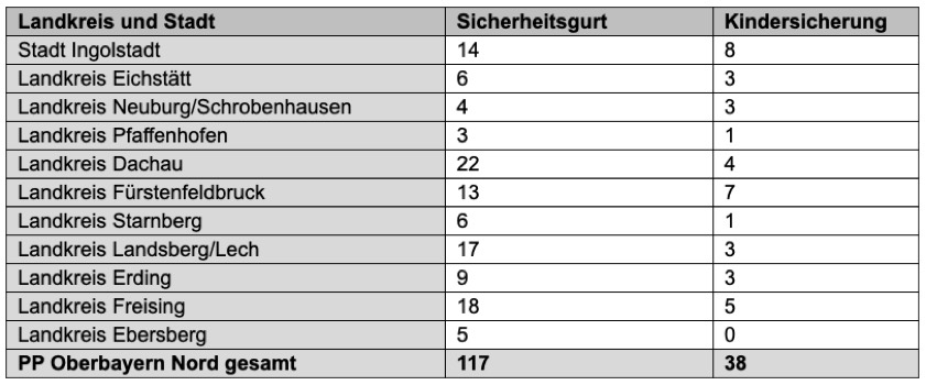 (ty) Am heutigen Mittwoch hat das in Ingolstadt ansässige Polizeipräsidium Oberbayern-Nord die Bilanz der Kontroll-Aktion veröffentlicht, die in der vergangenen Woche – wie angekündigt – von Dienstag bis Freitag im gesamten Zuständigkeits-Gebiet durchgeführt worden war. Den Angaben zufolge sei von den Beamten dabei ein besonderes Augenmerk auf die Gurt-Anlege- und Kinder-Sicherungs-Pflicht gelegt worden. Die Überprüfungen erfolgten "zu den relevanten Zeiten" im Bereich von Schulen und Kitas sowie auf stark frequentierten Schulwegen. Nachfolgend die Details sowie Zahlen aus den einzelnen Landkreisen.