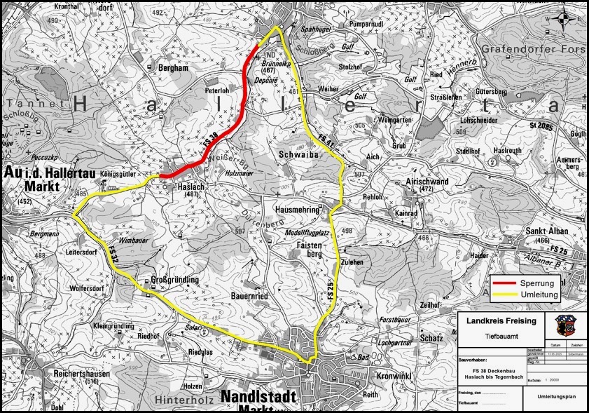 Anlieger könnten die Straße mit Einschränkungen nutzen, um zu ihren Anwesen zu gelangen. "Sie erhalten seitens der Baufirma noch zusätzliche Hinweise", heißt es aus der Kreis-Behörde. Der von Tegernbach kommende Verkehr werde bereits an der Abzweigung der Kreisstraße FS41 in Richtung Hausmehring über die FS25 nach Nandlstadt und die FS32 nach Au/Hallertau auf die FS38 in Richtung Haslach umgeleitet. Die Umleitung in der Gegenrichtung erfolge auf selber Strecke. Die Umleitung sei ausgeschildert, wird versichert. Der Umleitungs-Fahrplan für den MVV werde ausgehängt und sei unter www.mvv-muenchen.de abrufbar. (Grafik: Landratsamt Freising)