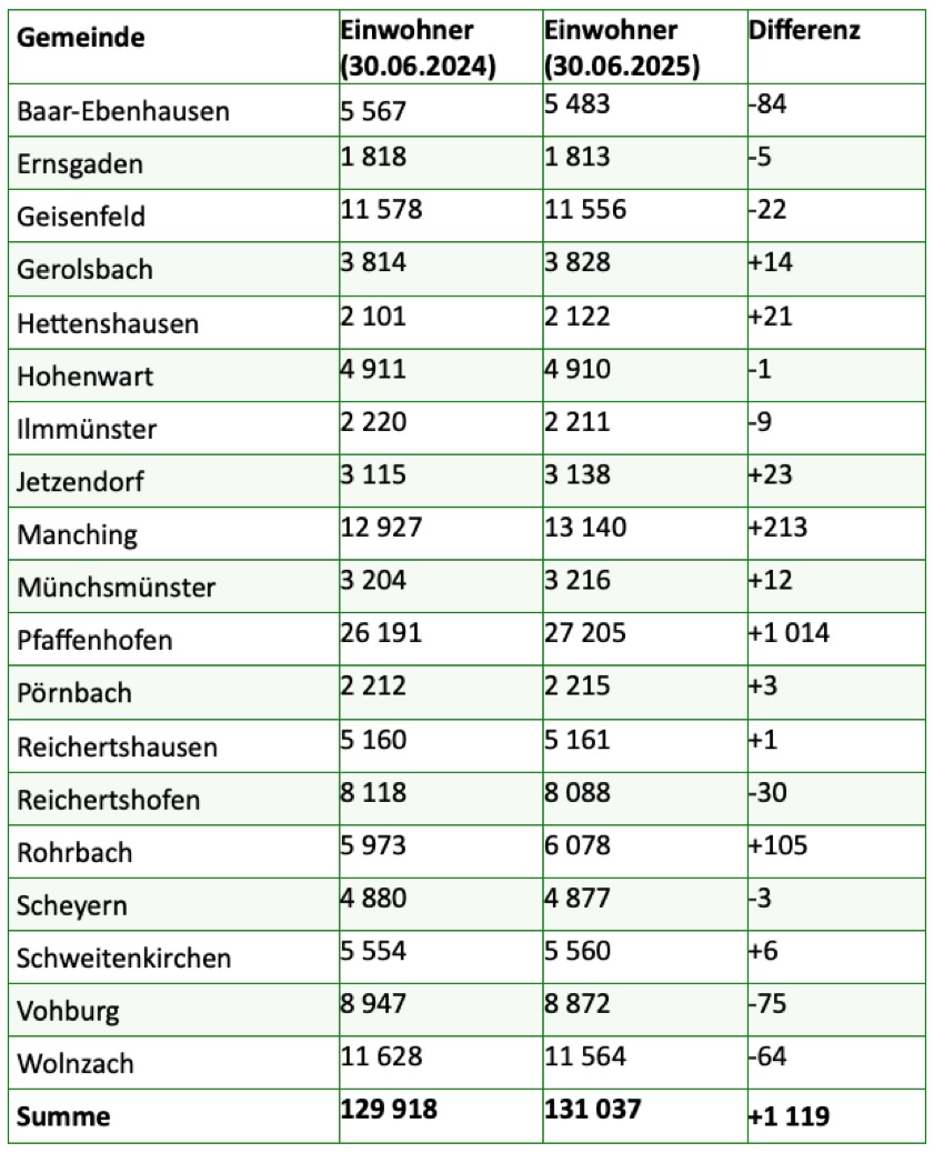 Nach Angaben des Landratsamts wurden die jetzt vorliegenden Einwohnerzahlen auf Basis des Zensus von 2022 fortgeschrieben. Diese Daten dienen den Angaben zufolge als Bemessungs-Grundlage in zahlreichen Bereichen, unter anderem beim kommunalen Finanz-Ausgleich, bei der Infrastruktur-Planung, bei der Gesundheits-Versorgung, bei der Stadt- und Regional-Entwicklung sowie auch in vielen Bereichen der Sozialpolitik. Am meisten Einwohner dazugewonnen hat nach den jetzt veröffentlichten Zahlen die Kreisstadt Pfaffenhofen, wo laut Statistik heuer zum Ende des ersten Halbjahres insgesamt 27 205 Menschen ihren Lebensmittelpunkt hatten – ein Plus von 1014 Personen binnen Jahresfrist.