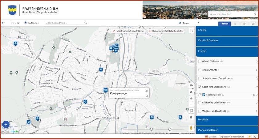 "In dem Portal können nicht nur die Wander- und Laufwege der Stadt mitsamt Höhenprofil angeschaut werden – man kann auch direkt nachsehen, ob ein Trinkbrunnen in der Nähe ist oder mit Hilfe der Routing-Funktion die Jogging-Strecke entlang der Kneipp-Anlage planen", heißt es weiter. "Bürgerinnen und Bürger sowie Gäste finden im Bereich Freizeit viele Sport- und Erlebnis-Möglichkeiten wie die Schwimmbäder, die Skate- oder Kletterhalle, Beachvolleyball-Felder sowie die vielen Spielplätze in Pfaffenhofen."