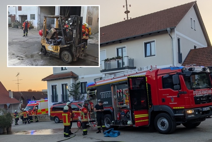 "Ein Gabelstapler ist vermutlich aufgrund eines technischen Defekts in Brand geraten", heißt es weiter. Mit Hilfe herbeigeeilter Nachbarn konnte das Feuer mit einem Gartenschlauch größtenteils abgelöscht werden. Wir löschten den restlichen Brand komplett ab." Alarmiert worden waren die Feuerwehren aus Geisenhausen, Wolnzach, Geroldshausen, Uttenhofen, Schweitenkirchen und Eschelbach sowie die Kreisbrandinspektion und das Technische Hilfswerk (THW) aus Pfaffenhofen. Auch der Rettungsdienst und die Polizei rückten an.