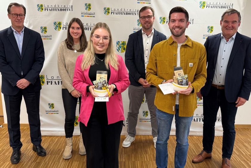(ty) Erfolgreiche Nachwuchskräfte am Landratsamt von Pfaffenhofen: Lea Nestler und Timo Pfab (Foto oben) haben jeweils ihre Abschluss-Prüfung zum Diplom-Verwaltungswirt bestanden und damit einen Meilenstein in ihrer beruflichen Laufbahn erreicht. Das wurde von der Kreis-Behörde offiziell mitgeteilt. Landrat Albert Gürtner und Sachgebiets-Leiter Christoph Ruppert sowie Ausbildungs-Beauftragte Sophia Fischer und Abteilungs-Leiter Walter Reisinger gratulierten den beiden jungen Leuten und wünschten ihnen viel Erfolg für die Zukunft. Die beiden Absolventen sind bereits in unterschiedlichen Sachgebieten am Landratsamt tätig.