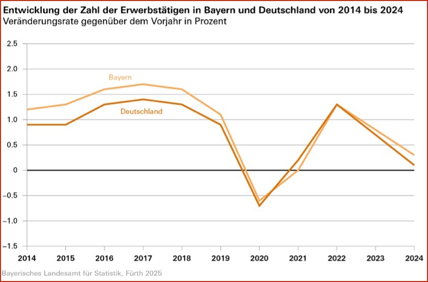 (ty) Die jüngsten vom Arbeitskreis "Erwerbstätigen-Rechnung der Länder" veröffentlichten Berechnungen der Erwerbstätigen-Zahlen zeigen für Bayern einen weiteren Anstieg. Dieser fällt jedoch mit 0,3 Prozent für das vergangene Jahr etwas moderater aus als in den beiden Vorjahren, in denen die Erwerbstätigen-Zahlen noch mit Veränderungsraten von 1,3 Prozent (2022) und 0,8 Prozent (2023) gewachsen waren. Durchschnittlich 7,87 Millionen Personen übten den Angaben zufolge im Freistaat im vergangenen Jahr eine auf Erwerb ausgerichtete Tätigkeit aus. Das waren knapp 23 000 mehr als im Jahr zuvor.