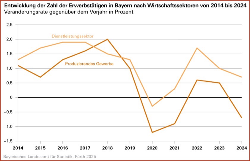 Die Erwerbstätigkeit entwickelte sich in den einzelnen Bereichen der Wirtschaft unterschiedlich. So ist der jüngste Zuwachs der Erwerbstätigkeit in Bayern auf ein weiteres Erstarken des Dienstleistungs-Sektors am Arbeitsmarkt zurückzuführen. Hier stiegen die Erwerbstätigen-Zahlen im vergangenen Jahr in Bayern um 0,7 Prozent auf 5,6 Millionen. Dagegen war die Beschäftigung im produzierenden Gewerbe – abgesehen vom Einbruch in den Corona- Jahren – zum ersten Mal seit 2003 wieder rückläufig: Etwa 14 600 Personen weniger als im Vorjahr waren 2024 in den produzierenden Wirtschafts-Bereichen erwerbstätig. Das entspricht einem Rückgang von 0,7 Prozent.