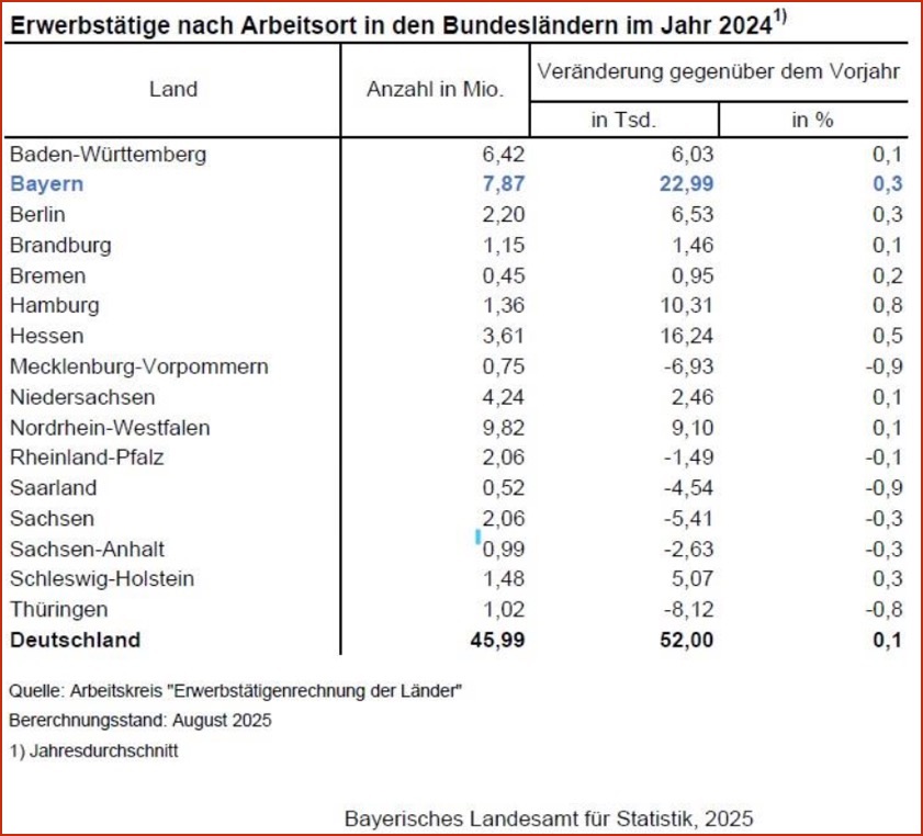 Mit diesem Zuwachs liegt Bayern gemeinsam mit Berlin und Schleswig-Holstein, die ebenfalls ein Wachstum von 0,3 Prozent verzeichnen konnten, über dem deutschlandweiten Anstieg von 0,1 Prozent. Lediglich in Hessen (plus 0,5 Prozent) und Hamburg (plus 0,8 Prozent) nahm die Beschäftigung noch stärker zu. Demgegenüber waren sieben Bundesländer von einem Beschäftigten-Rückgang betroffen. Am deutlichsten fiel dieser mit einem Minus von 0,9 Prozent in Mecklenburg-Vorpommern und im Saarland aus.