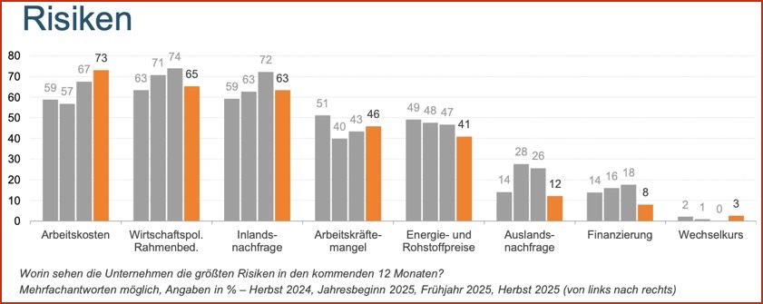 Die Risiko-Lage habe sich verändert: Erstmals geben die Betriebe laut IHK die Arbeits-Kosten mit 73 Prozent der Nennungen als Haupt-Risiko an. Das sei eine Steigerung um 14 Prozentpunkte gegenüber dem Vorjahr. An zweiter und dritter Stelle folgen den Angaben zufolge aktuellen die wirtschafts-politischen Rahmenbedingungen (65 Prozent) und die fehlende Inlands-Nachfrage (63 Prozent). "Beide Risiken entfernen sich zwar von ihren Rekordwerten der letzten Befragung, bleiben aber dominierend." Die Zoll-Einigung zwischen den USA und der EU scheine etwas Planbarkeit für das Auslands-Geschäft geschaffen zu haben.