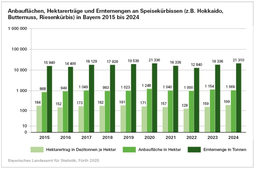Bayerns Anteil an der deutschen Gesamt-Erzeugung von Speise-Kürbissen im Freiland von 114 284 Tonnen lag im vergangenen Jahr bei 18,6 Prozent. Mit den besagten 21 310 Tonnen belegte der Freistaat im Bundes-Ranking Platz drei – nur Rheinland-Pfalz und Nordrhein-Westfalen erzeugten mit 23 167 Tonnen beziehungsweise 26 972 Tonnen mehr Speise-Kürbisse. Der in Bayern erzielte Hektar-Ertrag lag im vergangenen Jahr mit 199,5 Dezitonnen pro Hektar um 25,5 Prozent höher als im Jahr zuvor, als 158,9 Dezitonnen pro Hektar errechnet wurden.