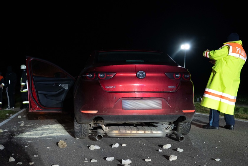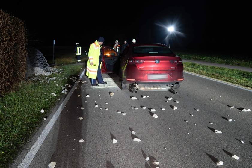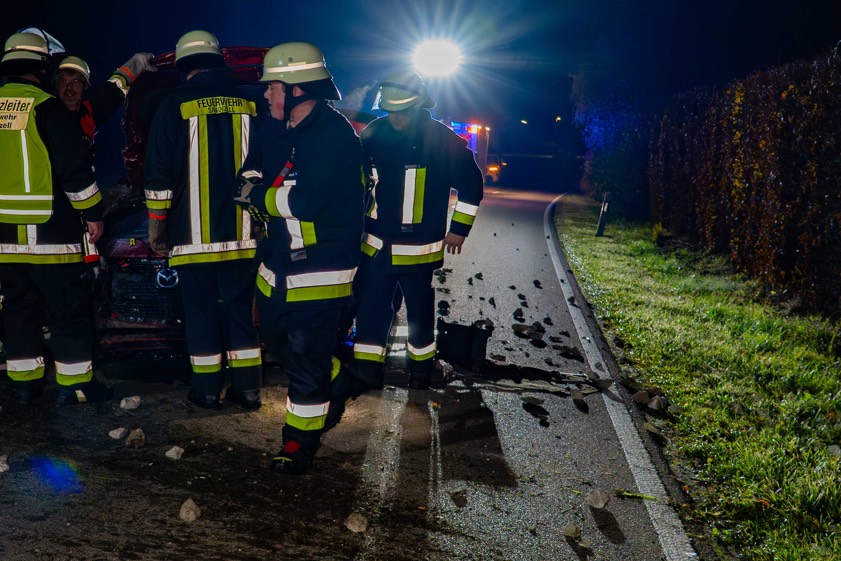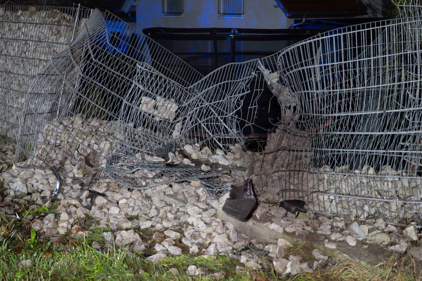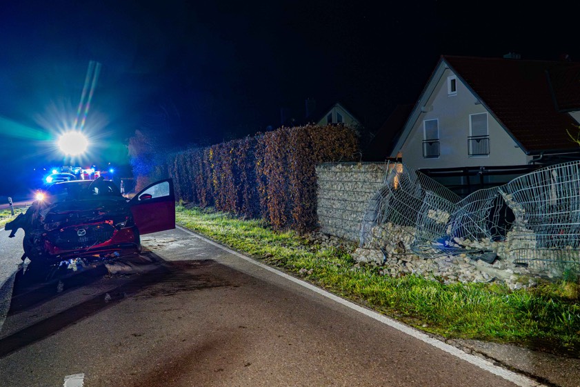 33-Jähriger krachte gestern Abend am Ortseingang von Sandizell mit seinem Pkw in eine Gabionen-Mauer. Er und sein Beifahrer (23) in Klinik gebracht.