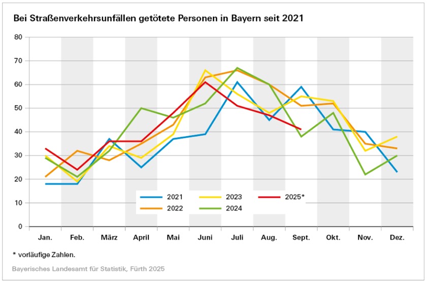 Wie das Landesamt für Statistik weiter erklärt, ist die Zahl der im Straßenverkehr in Bayern verunglückten Personen heuer im September im Vergleich zum Vorjahres-Monat um 17,1 Prozent auf 4895 gesunken. Ums Leben gekommen sind 41 Menschen, das sind drei mehr als im September vergangenen Jahres. Die Zahl der Verletzten reduzierte sich um 17,3 Prozent auf 4854. Davon wurden 4221 Personen leicht verletzt (Vorjahres-Monat: 4983) und 633 schwer verletzt (Vorjahres-Monat: 887).