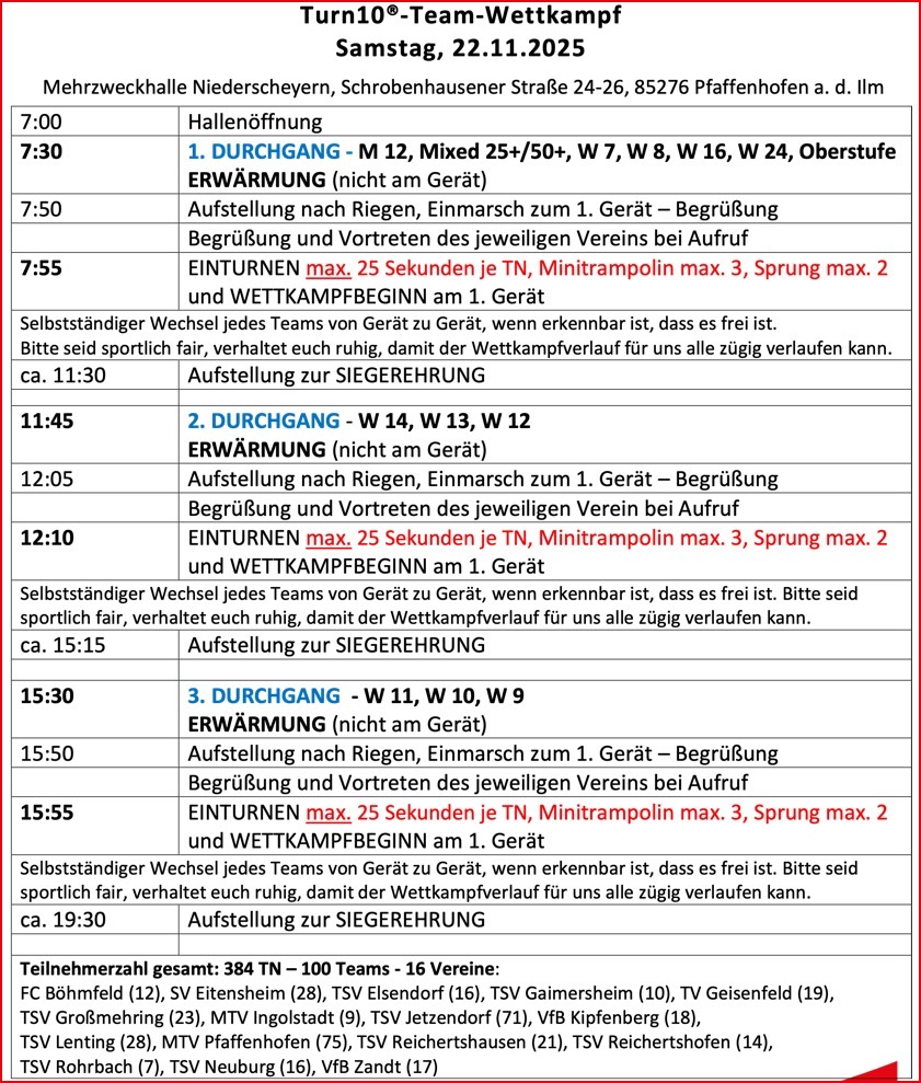 (ty) Die Neuauflage eines großen Sport-Events, das sich zunehmender Beliebtheit erfreut, steht am morgigen Samstag, 22. November, in Pfaffenhofen-Niederscheyern an. Der Turngau Donau-Ilm veranstaltet in der dortigen Mehrzweck-Halle seinen diesjährigen "Turn10"-Team-Wettkampf. Laut Ankündigung der Organisatoren sind für die Veranstaltung insgesamt 384 junge Sportlerinnen und Sportler aus 16 Vereinen gemeldet. Damit ist die Zahl der Teilnehmer gegenüber dem Vorjahr nochmals um 70 geklettert, was einen neuerlichen Rekord bedeutet. Den detaillierten Zeitplan finden Sie am Ende dieses Beitrags.