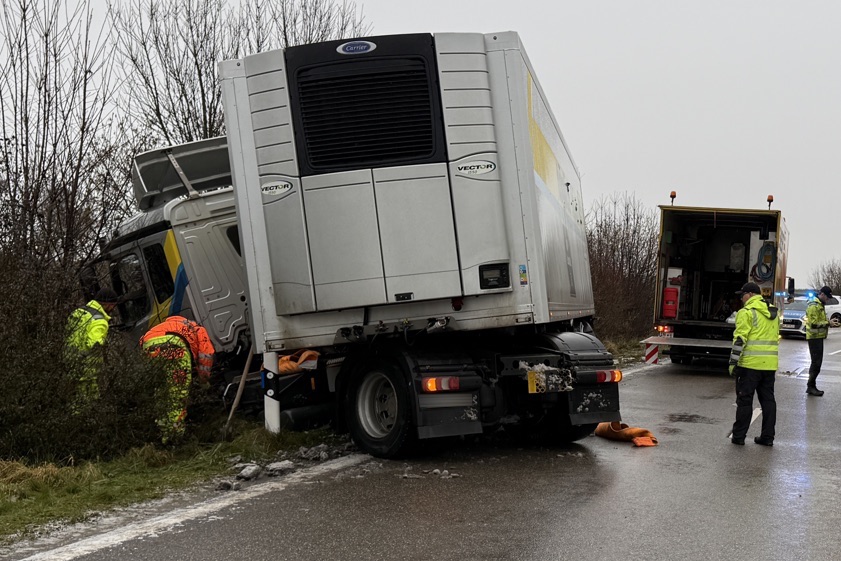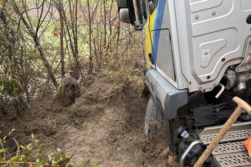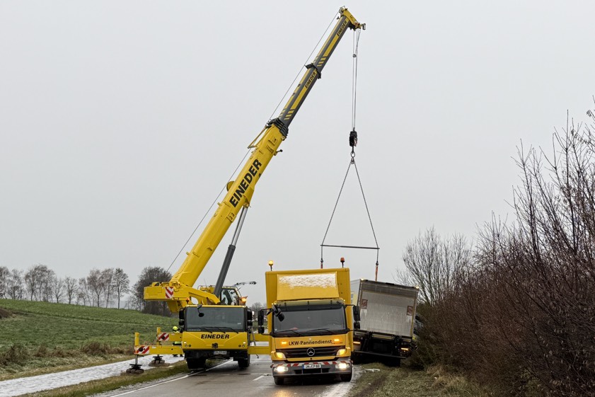 Staatsstraße 2050 war nach dem Unfall am heutigen Morgen wegen der Bergungs-Arbeiten gesperrt. Lkw-Fahrer (38) blieb unverletzt.