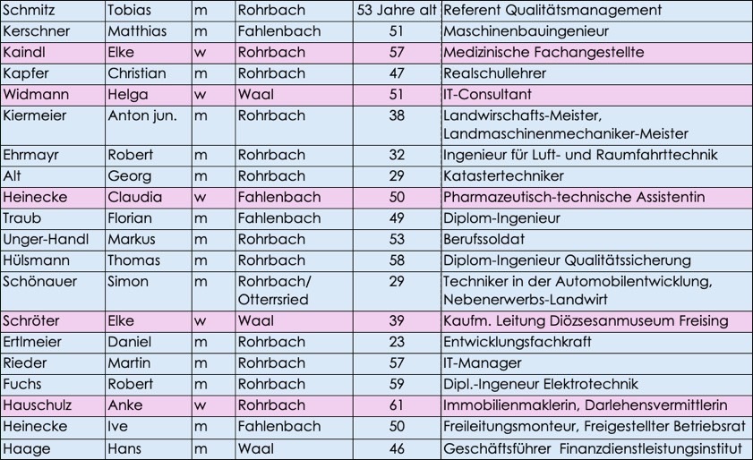 Die 15 Männer und fünf Frauen umfassende Kandidaten-Riege wird angeführt von Tobias Schmitz (53), Matthias Kerscher (51) und Elke Kaindl (57).