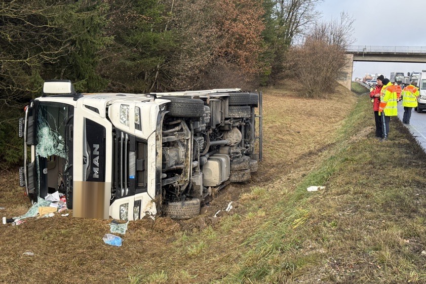 Laut Polizei geriet der Lkw heute Vormittag langsam von der Strecke und kippte im Grünstreifen um. Verkehrs-Behinderungen und Stau in Richtung Süden.