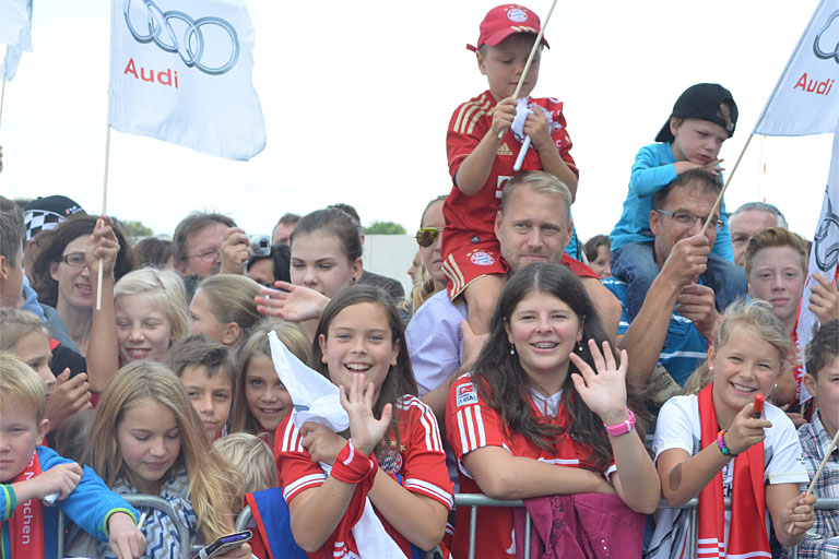Bisher hat dieses Aufsehen erregende Ereignis immer auf dem Audi-Forum in Ingolstadt stattgefunden, doch dieses Jahr hatte man sich für die neue Location bei Heinrichsheim entschieden. Hauptsächlich, weil sich direkt auf dem riesigen Audi-Gelände eine große Rennstrecke befindet, auf der die Weltstars ihre neuen Dienstwagen auch gleich ausgiebig testen konnten. Doch zuerst wurde sich erst einmal bei den Fans bedankt. Manuel Neuer, Bastian Schweinsteiger, Mario Götze & Co. unterschrieben hunderte Schals, Poster und Fahnen.