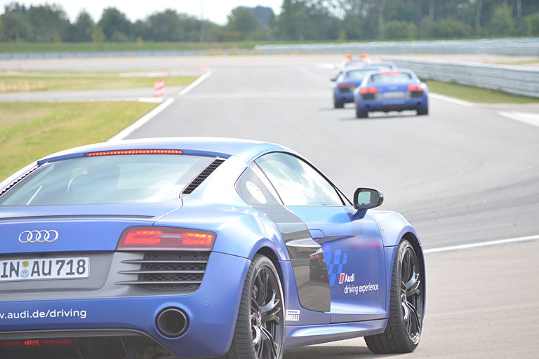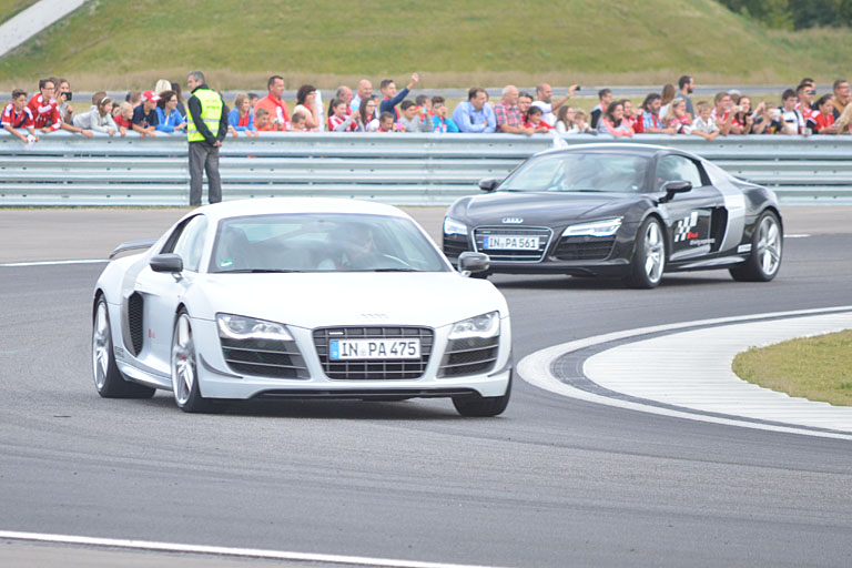 Unterteilt in drei Gruppen stellten sich die Fußballprofis verschiedenen Fahrsituationen auf dem Übungsgelände. Bei Handling-Fahrten im R8 unter Anleitung erfahrener Audi-Instruktoren konnten die Bayern-Spieler fahrdynamisches Talent beweisen. Und abseits asphaltierter Wege konnten sich die Fußball-Stars im „Audi A6 allroad“ in einem Offroad-Parcours versuchen.