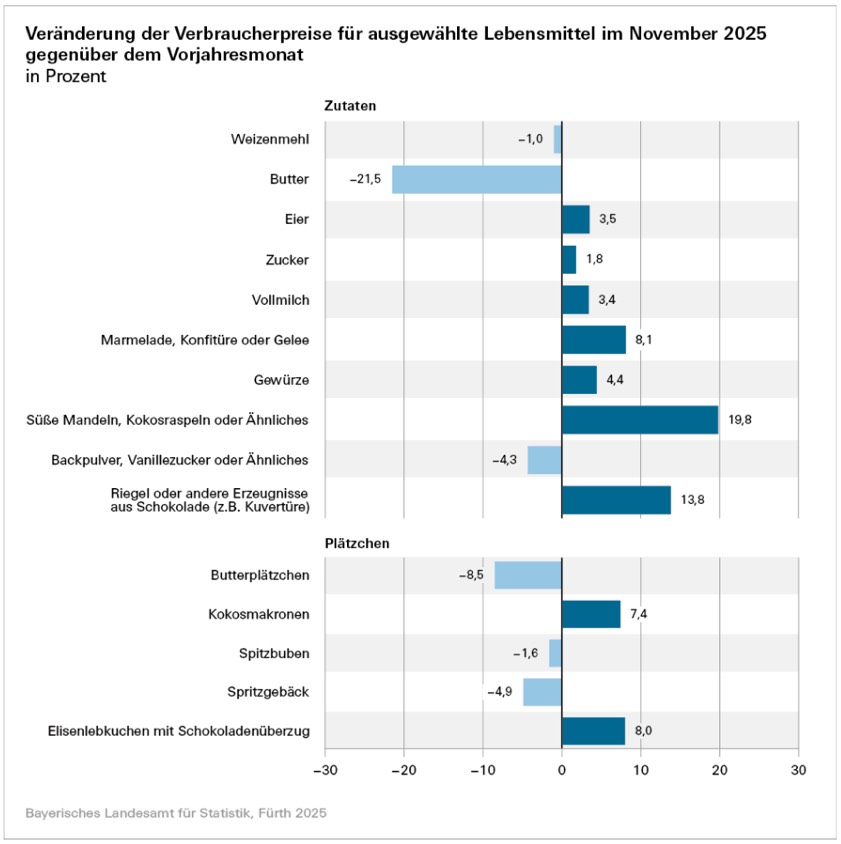 Aber auch Eier (plus 3,5 Prozent), Zucker (plus 1,8 Prozent) und Vollmilch (plus 3,4 Prozent) wurden im Vergleich zum November vergangenen Jahres teurer. Nach massiven Preissteigerungen im Vorjahr war Butter im November dieses Jahres hingegen wieder günstiger zu haben (minus 21,5 Prozent). Weizenmehl (minus 1,0 Prozent) sowie Backpulver, Vanillezucker und Ähnliches (minus 4,3 Prozent) wurden ebenfalls günstiger.