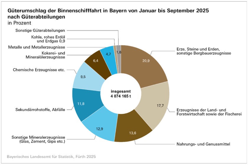 In den Häfen der bayerischen Bundeswasserstraßen wurden in den ersten drei Quartalen des laufenden Jahres nach Erkenntnissen der Statistik-Behörde hauptsächlich "Erze, Steine und Erden" (20,9 Prozent) umgeschlagen. "Erzeugnisse der Land- und Forstwirtschaft" (17,7 Prozent) waren der zweitgrößte Posten. "Nahrungs- und Genussmittel" machten 13,6 Prozent aus, und 12,9 Prozent der umgeschlagenen Güter entfielen auf "sonstige Mineral-Erzeugnisse" wie Glas, Zement oder Gips.