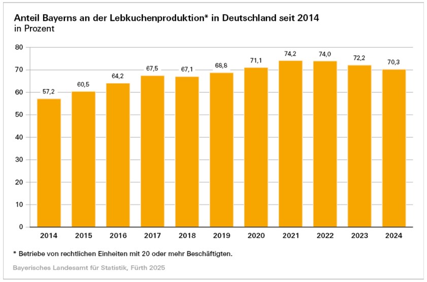 Seit dem Jahr 2014 beträgt der bayerische Produktions-Anteil dieser beliebten Leckereien, zu denen nach dem Güterverzeichnis für Produktions-Statistiken auch Honigkuchen oder ähnliche Waren gezählt werden, stets mehr als 50 Prozent an der bundesweiten Produktion. "Somit ist und bleibt Bayern das Land der Lebkuchen", fasst das Landesamt für Statistik zusammen. Die Angaben bezögen sich auf Betriebe von Unternehmen (rechtliche Einheiten) mit 20 oder mehr Beschäftigten. In Bayern seien dies im vergangenen Jahr 36 Betriebe gewesen.
