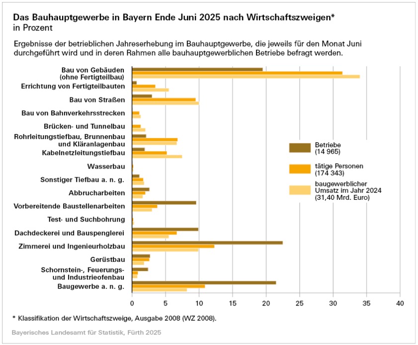 Der baugewerbliche Umsatz betrug im Juni vergangenen Jahres insgesamt 2,70 Milliarden Euro. Damit lag er nominal um 0,7 Prozent unter dem Wert des Vorjahres-Monats. Die 5670 Bauhauptgewerbe-Betriebe mit Sitz in Oberbayern erwirtschafteten davon 806,43 Millionen Euro. In vier der sieben bayerischen Regierungsbezirke wurde im Vergleich zum Juni 2024 ein niedrigerer baugewerblicher Umsatz erzielt. Die Rückgänge reichten von 0,5 Prozent in Oberbayern bis zu 7,6 Prozent in Mittelfranken. In der Oberpfalz, in Oberfranken und in Schwaben stieg der Umsatz hingegen jeweils um rund 3 Prozent.