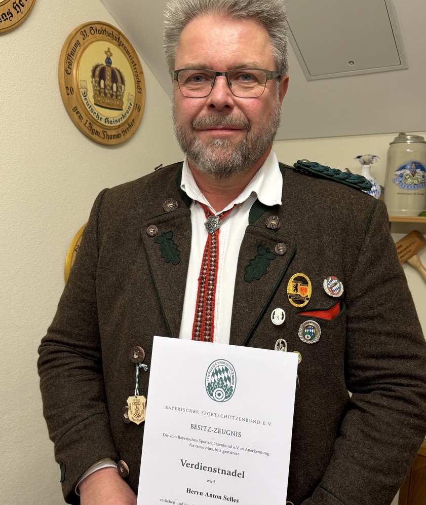 Anton Selles erhielt die Verdienst-Nadel des bayerischen Sportschützenbunds.